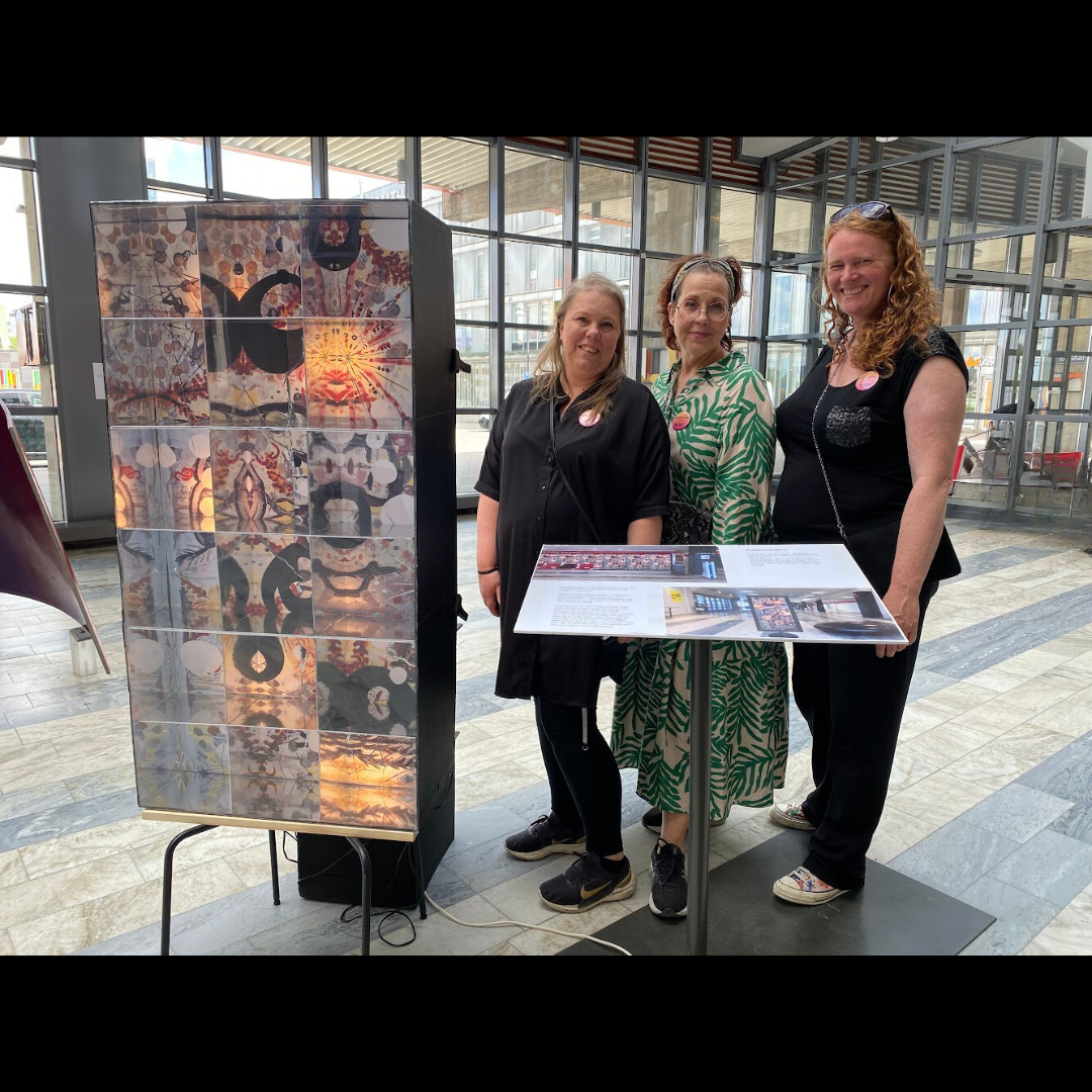 Även om det är tillfredställande att ha konstutställningar och att sälja konsten jag skapar så är det inte syftet med mitt skapande. Jag skapar för min egen skull, när jag vill, vad jag vill och på det sätt jag vill. Här intill ses jag och mina medskapande konstnärer Ethel Björklund och Inger Larsson när vi visade upp skissförslag för Huddinge sjukhus entré i samarbete med Locum, Kulturförvaltningen och Södra Stockholms folkhögskola.